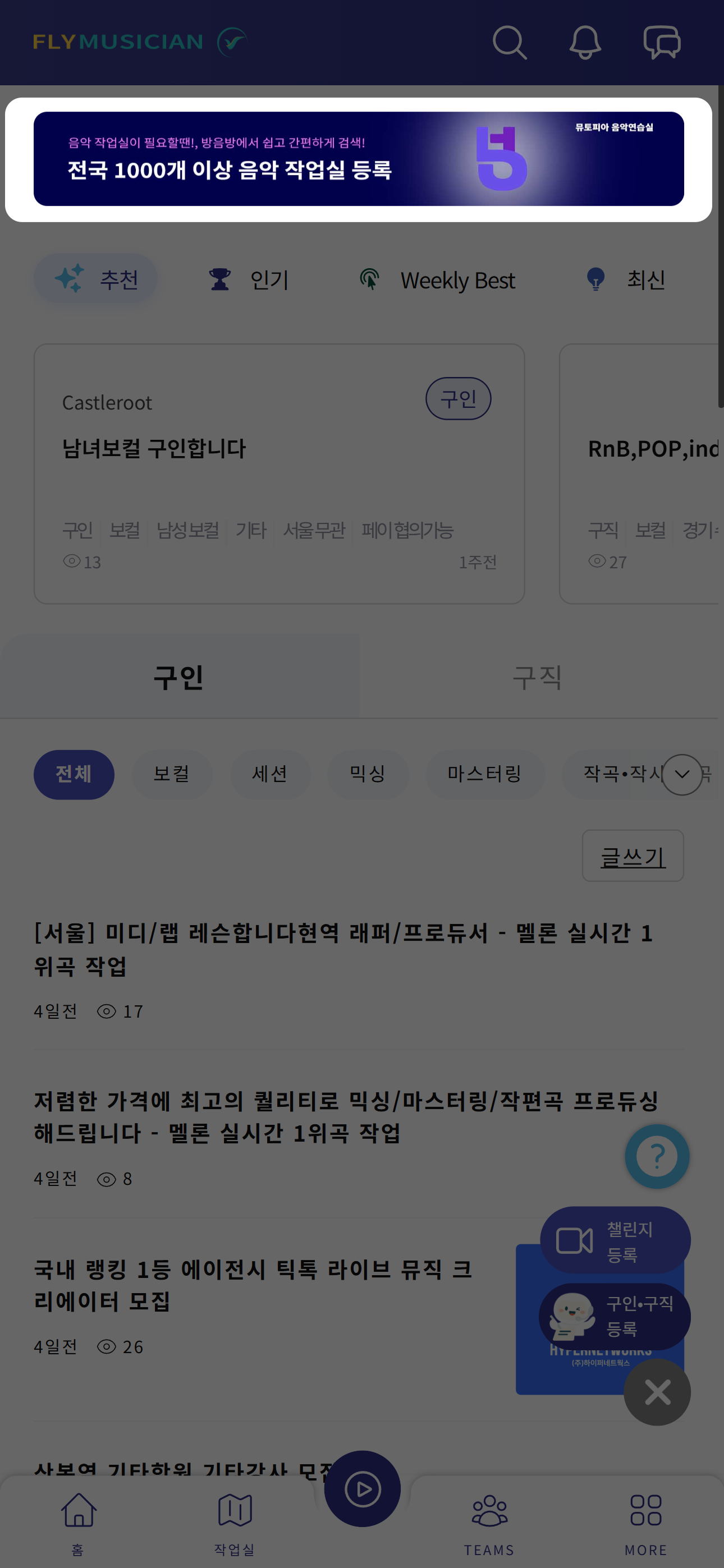 목록에 자연스럽게 스며들어, 뮤지션들이 관심있는 제품(서비스)을 알려보세요. #광고신청